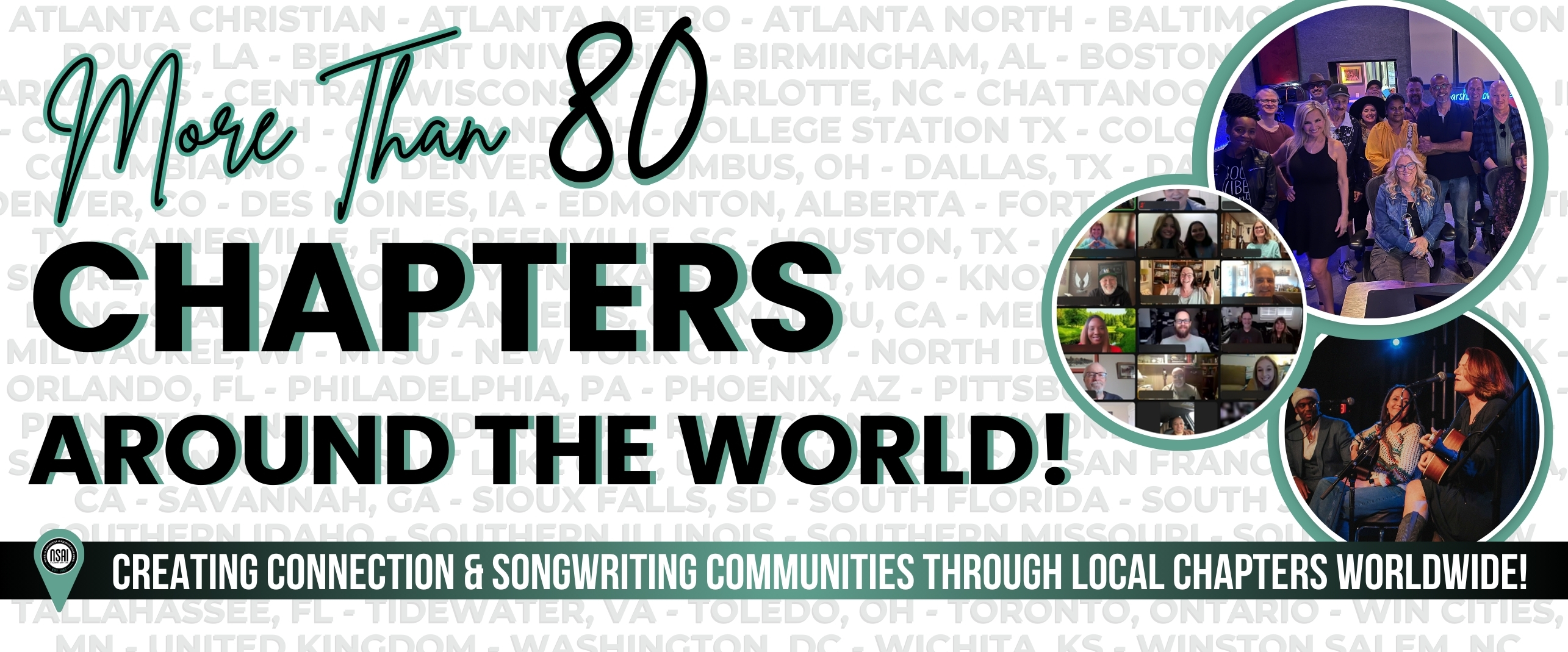 Whether you live in Nashville, Tennessee, Spokane, Washington, or even overseas, we have numerous ways to connect either in-person or online with the services and your fellow songwriters. Explore chapter locations, our services offered to help you develop your writing skills, and ways to connect!
